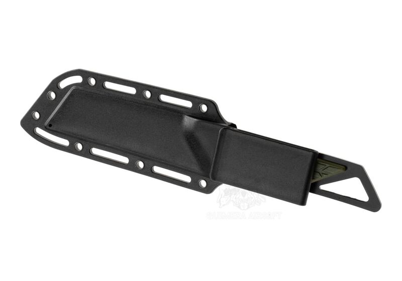La hoja está fabricada en acero inoxidable de alto rendimiento con recubrimiento negro, lo que proporciona una excelente resistencia a la corrosión y a los impactos. Su forma amplia y plana le confiere una gran capacidad de corte y control, especialmente útil en tareas de bushcraft o campamento.