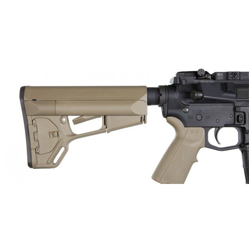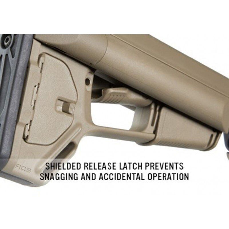 Similar a la reconocida Magpul CTR®, la ACS cuenta con un sistema anti-enganche que evita activaciones accidentales, junto con un mecanismo de bloqueo por fricción adicional que reduce el movimiento excesivo de la culata, mejorando así la estabilidad del arma y la precisión del tirador.