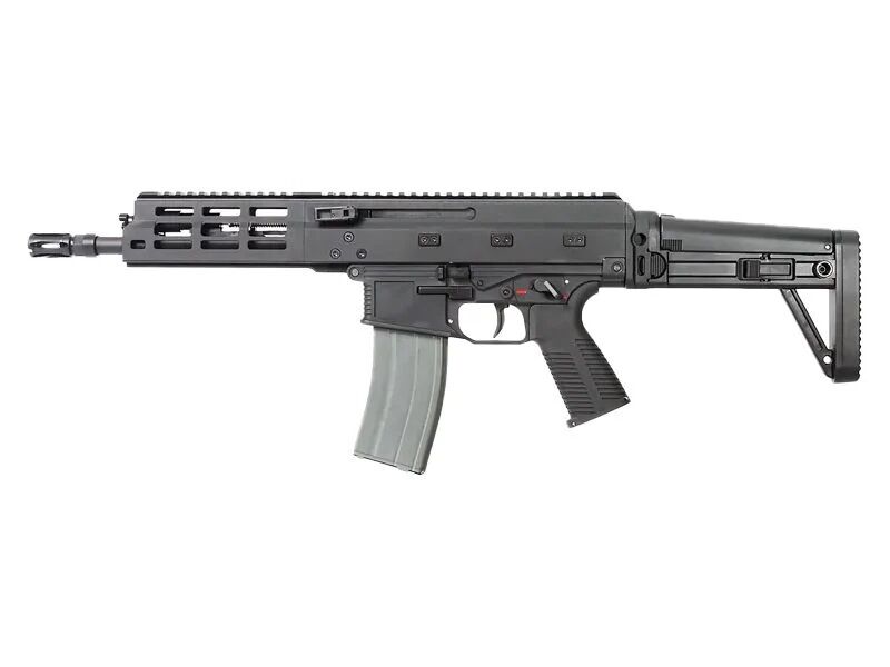 Una de sus principales virtudes es la culata plegable y regulable en longitud, que permite adaptar la réplica tanto a espacios cerrados como a entornos más amplios. Con la culata recogida, su tamaño se reduce considerablemente, facilitando su transporte y uso en escenarios CQB. Además, incorpora un guardamanos de aluminio con sistema M-LOK, ideal para montar accesorios como linternas, grips o láseres sin añadir peso innecesario. Todo el cuerpo de la réplica está fabricado en acero, aleación de aluminio y polímero de alta resistencia, garantizando durabilidad sin comprometer la maniobrabilidad.