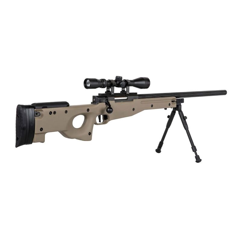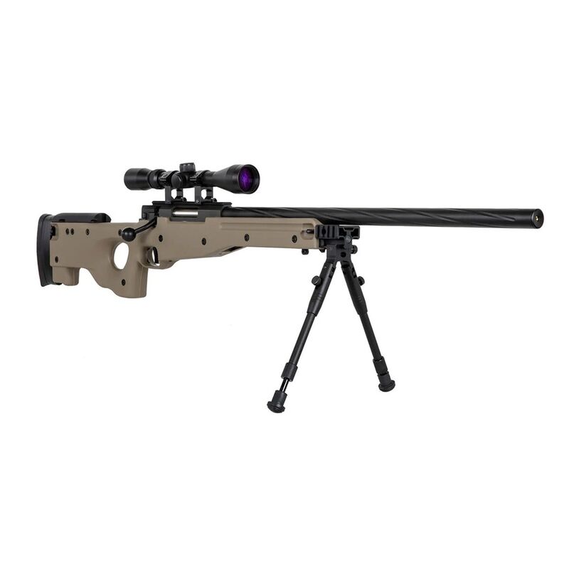 La potencia de disparo ronda los +/- 560 FPS, ofreciendo una excelente base para partidas de larga distancia. Además, el conjunto incluye un visor óptico de aumento y un bípode metálico plegable para mejorar la estabilidad en disparos de precisión.
