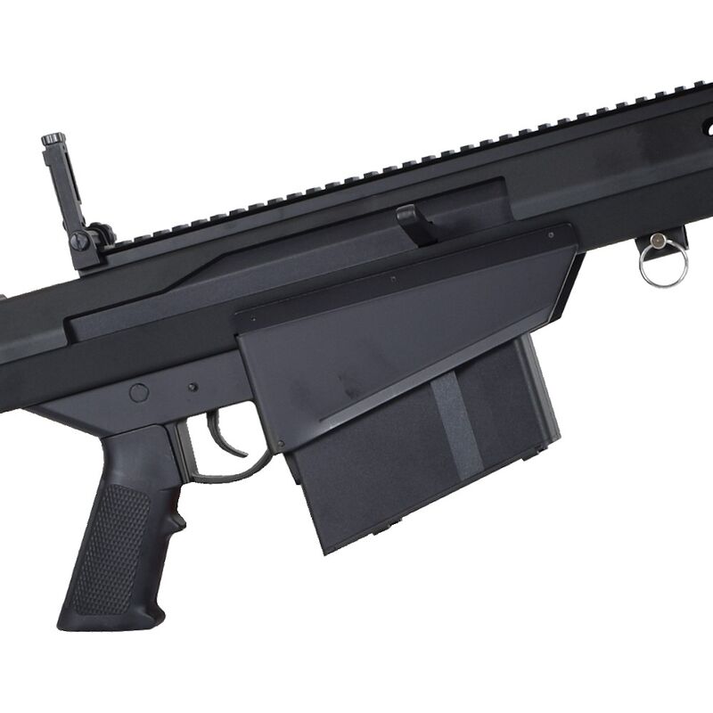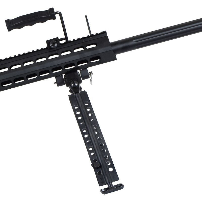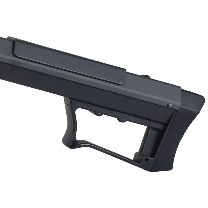 La réplica M107 Barrett — Snow Wolf reproduce la silueta y presencia del arma real en formato airsoft bolt-action, con licencia oficial BARRETT (6mmPROSHOP) para asegurar acabados fieles. Cuenta con receivers y outer barrel metálicos, pistol grip y flash hider en polímero, cargador mid-cap metálico de 50 BB, riel superior 20 mm para ópticas, bípode metálico plegable y un monopod ajustable y desmontable en la culata; además trae miras plegables y hop-up ajustable para optimizar la precisión. Su construcción busca tanto realismo estético como durabilidad en uso recreativo y de coleccionismo.