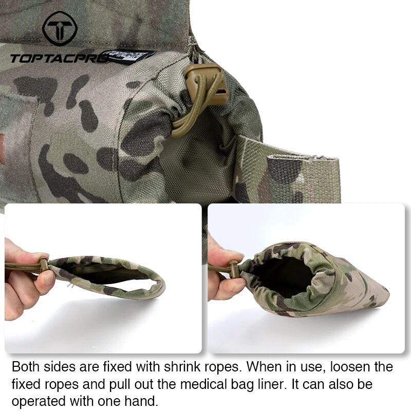El Medic Pouch tipo Roll 1 Trauma Pouch Ferro de TopTacPro es un pouch médico de despliegue rápido diseñado para alojar contenido IFAK (kit de primeros auxilios individual)/ Monster y/o similares y montarse en portaplacas, battle belts o cualquier superficie con velcro. Su diseño ambidiestro y abierto en ambos extremos permite un acceso inmediato al equipo médico desde ambos lados del operador, facilitando la atención en combate.