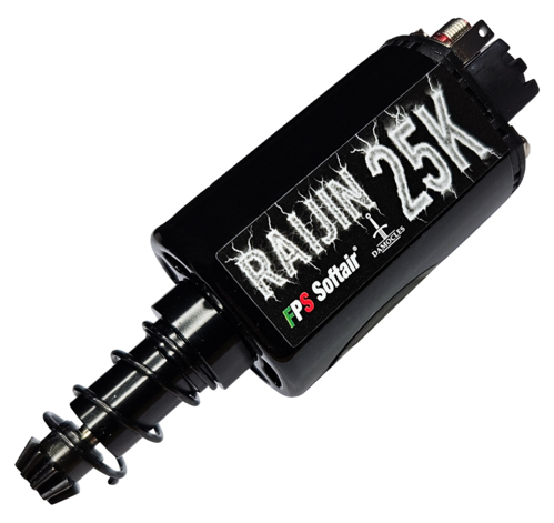 El FPS Raijin 25K (eje largo) es un motor DC de alto rendimiento diseñado en Italia por FPS Softair, en colaboración con Damocles y La Tartaruga Softair (LTS). Concebido para configuraciones exigentes, ofrece un equilibrio perfecto entre par elevado y alta velocidad, garantizando una respuesta inmediata en semiautomático y un funcionamiento suave y fiable.