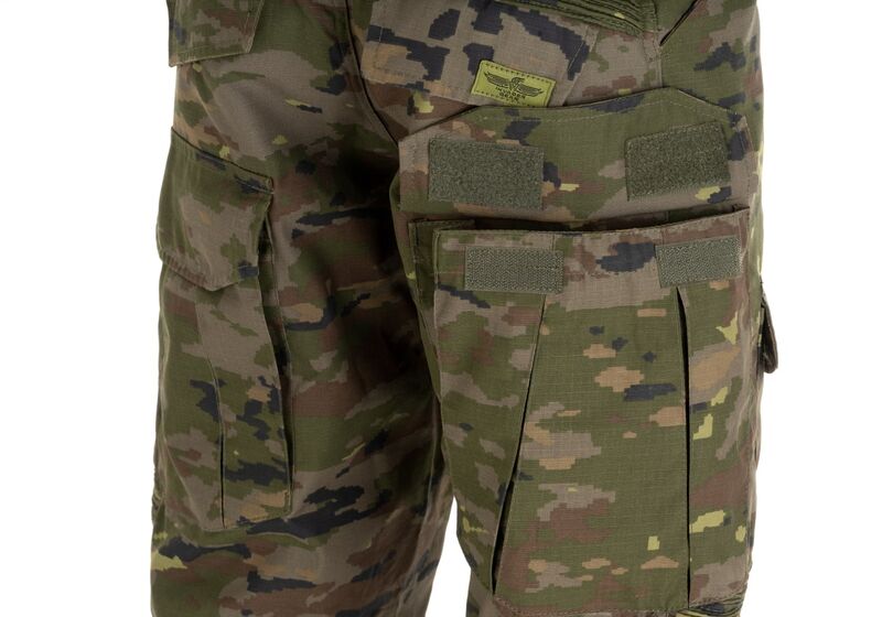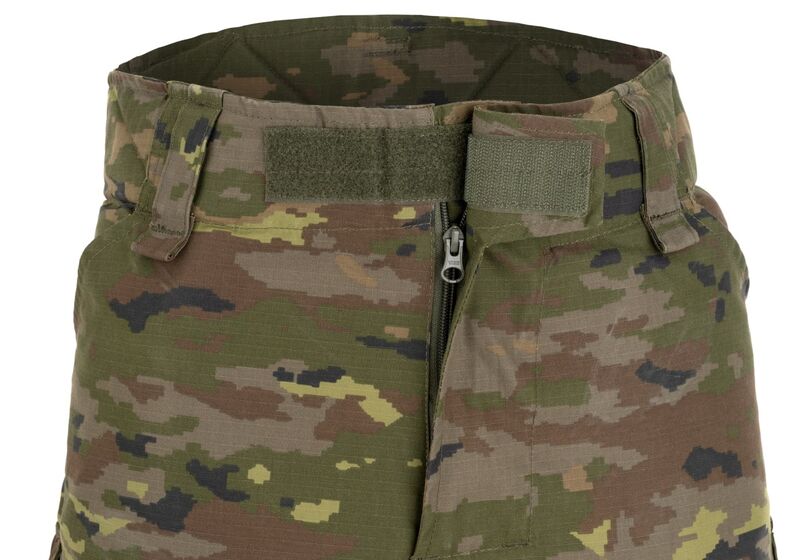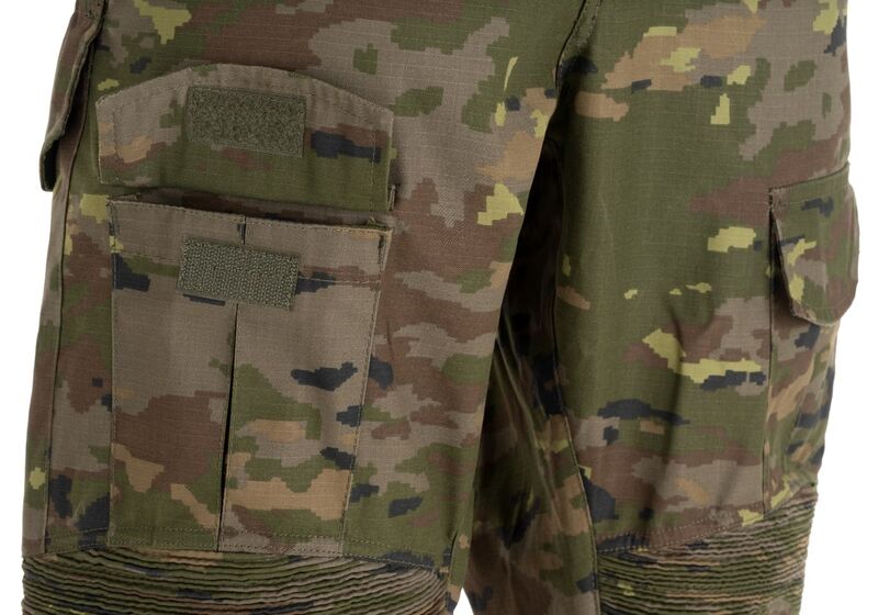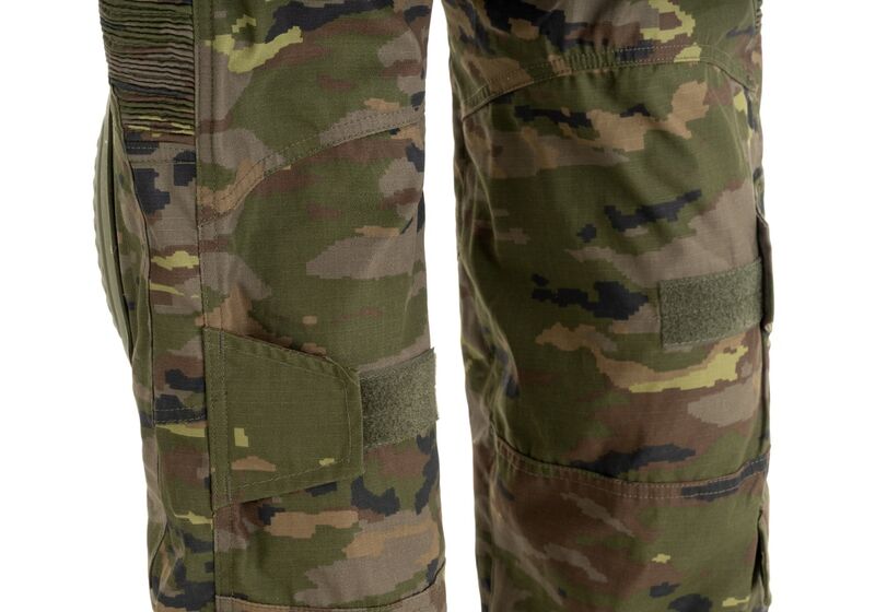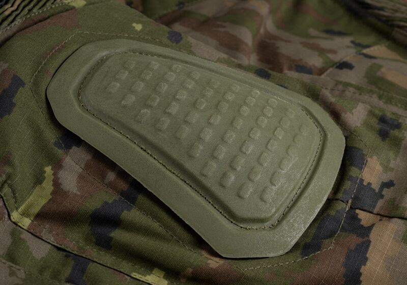 En el área debajo del cinturón y alrededor de las rodillas, se encuentra un tejido elástico para mayor comodidad y alta movilidad. Se incluyen almohadillas diseñadas para proteger las articulaciones al distribuir eficientemente la energía del impacto. Estas se ajustan perfectamente al usuario gracias al sistema de ajuste en el interior de los bolsillos superiores y las correas alrededor de las rodillas. Cuenta con varios bolsillos a su disposición: 2 abiertos en la cintura, 2 grandes bolsillos de carga en cada lado del muslo trasero con cierres de gancho y bucle, 2 bolsillos medianos en la parte delantera, 2 bolsillos pequeños en la parte inferior de la pierna y otros 2 bolsillos en la parte trasera de los pantalones.