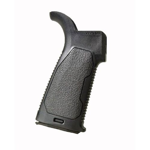 Su perfil más estilizado y cónico en la zona del arco de la mano permite una mayor libertad de movimiento al manipular los controles del arma, mientras que su anchura en la palma garantiza comodidad incluso en sesiones prolongadas de uso. Además, incorpora una cómoda cola de castor (“beaver tail”) que aporta estabilidad y soporte, y un compartimento seguro bajo una tapa de goma para almacenar pequeños accesorios.