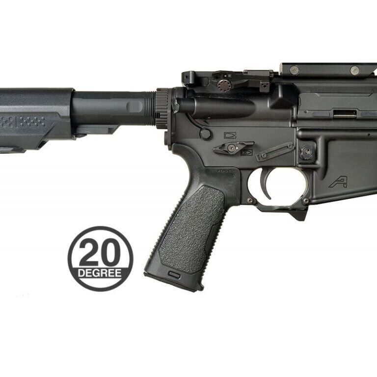 Su perfil más estilizado y cónico en la zona del arco de la mano permite una mayor libertad de movimiento al manipular los controles del arma, mientras que su anchura en la palma garantiza comodidad incluso en sesiones prolongadas de uso. Además, incorpora una cómoda cola de castor (“beaver tail”) que aporta estabilidad y soporte, y un compartimento seguro bajo una tapa de goma para almacenar pequeños accesorios.