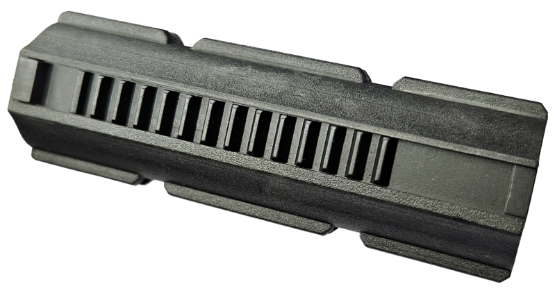 Las guías de deslizamiento minimizan la fricción y retienen el lubricante durante largos períodos. El asiento descentralizado del rack favorece un acoplamiento perfecto con los dientes del engranaje sectorial. Los refuerzos longitudinales a los lados de los dientes aumentan la robustez y evitan el contacto del rack con la pared interna del cilindro.