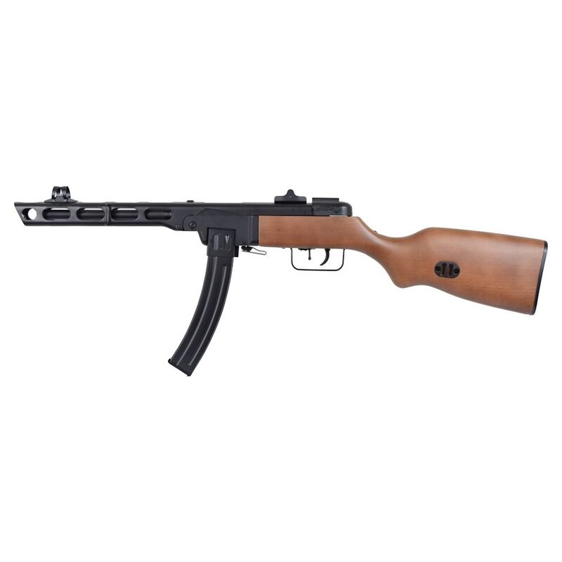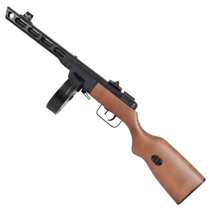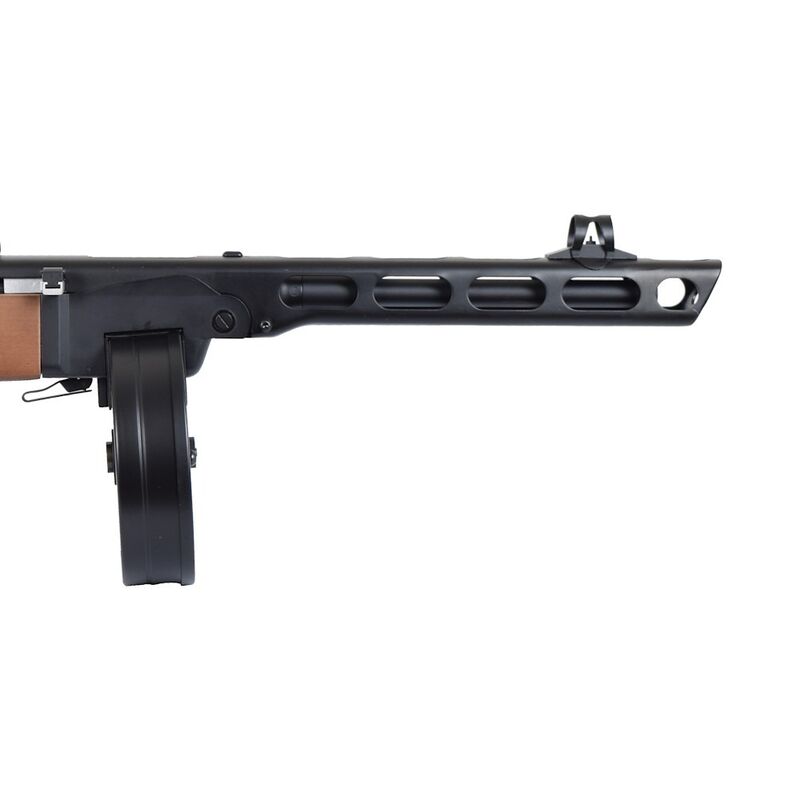 El PPSh-41 (Pistolet-Pulemyot Shpagina) es un subfusil soviético icónico de la Segunda Guerra Mundial, diseñado por Georgy Shpagin como arma barata, fiable y de alta cadencia para la infantería. Originalmente en calibre 7,62×25 Tokarev, se caracteriza por su ritmo de disparo muy alto (alrededor de 900 disparos por minuto en muchas fuentes), su simplicidad mecánica y por el uso de cargadores tambor de gran capacidad (la versión clásica tenía tambor de 71 cartuchos) que lo convirtieron en una pieza temida en combates cercanos y urbanos. Su diseño priorizaba la producción en masa y la facilidad de uso en condiciones adversas.