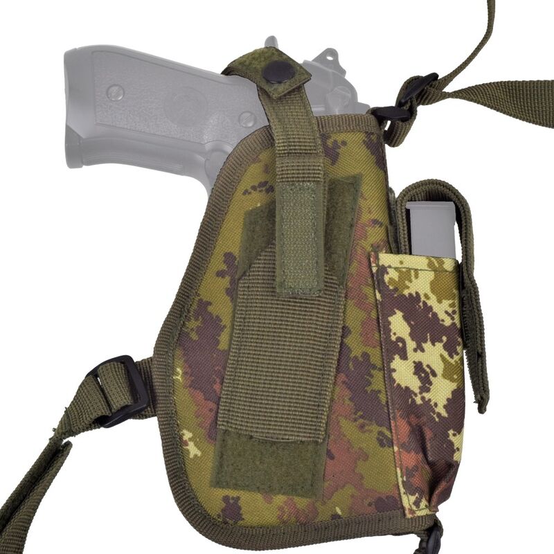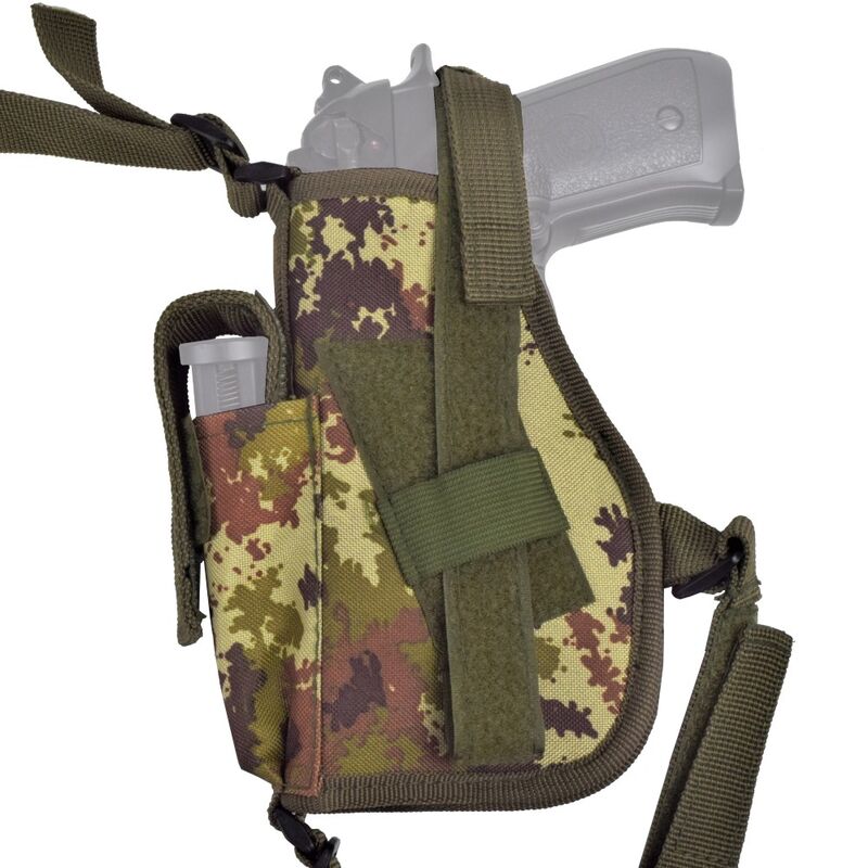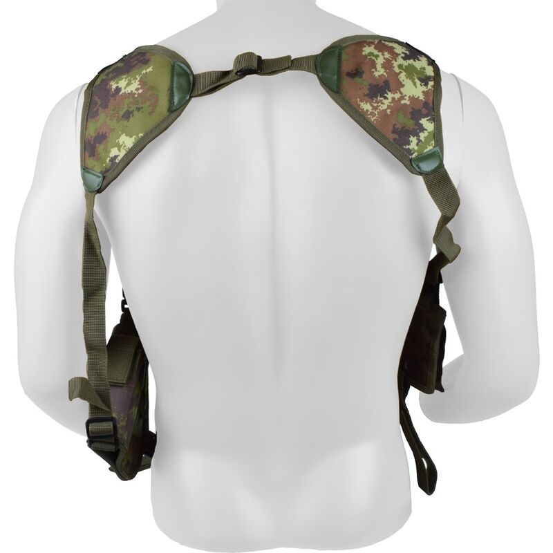 Incorpora cierre por botón para una retención fiable del arma y un sistema de ajuste mediante velcro que permite adaptarla fácilmente a la complexión del usuario. En el lado opuesto integra portacargadores con cierre de velcro, proporcionando un equilibrio perfecto y acceso rápido a la munición.