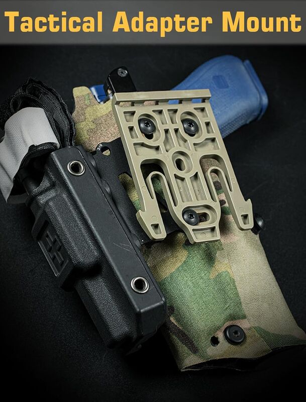 Fabricado en aluminio mecanizado, garantiza una resistencia superior al desgaste y a impactos, manteniendo un perfil bajo y un ajuste firme. Su diseño compacto permite montarlo en la parte frontal o lateral de la funda, así como directamente en plataformas MOLLE, optimizando el espacio y la funcionalidad del equipo.