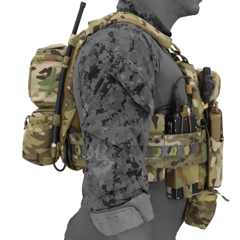 El bolsillo superior incluye además un compartimento interno con cremallera, perfecto para guardar objetos pequeños de forma segura. En el exterior, cuenta con panel de velcro para parches de identificación, y ambos lados integran presillas elásticas para el guiado de cables o sistemas de comunicación.