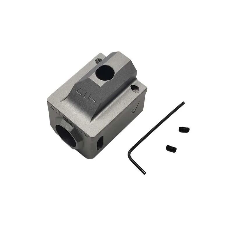Dale un look agresivo y profesional a tu réplica con el Compensador Tipo Agency Arms "Modelo A" para Glock, diseñado específicamente para montarse en cañones con rosca de 14mm CCW. Inspirado en los modelos reales usados por tiradores profesionales, este accesorio no solo mejora la estética, sino que también puede actuar como bocacha si lo combinas con trazadores o extensiones de cañón.