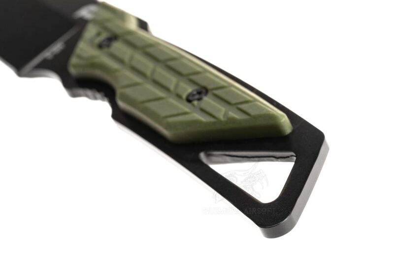 La hoja está fabricada en acero inoxidable de alto rendimiento con recubrimiento negro, lo que proporciona una excelente resistencia a la corrosión y a los impactos. Su forma amplia y plana le confiere una gran capacidad de corte y control, especialmente útil en tareas de bushcraft o campamento.