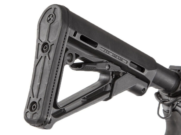 • Cheek weld / ergonomía: Sloping cheek weld para equilibrio entre bajo perfil y confort; compatible con Magpul CTR Cheek Risers.