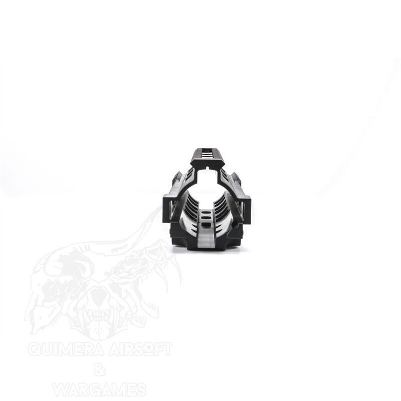 1. Este guardamanos es compatible con réplicas tipo MWS utilizando el adaptador correspondiente, disponible AQUÍ. En algunos casos puntuales puede ser necesario realizar un ligero ajuste en la zona de las aletas. Alternativamente, puede instalarse un cañón de fibra de carbono, también disponible AQUÍ, lo que permite el montaje sin necesidad de usar el adaptador.