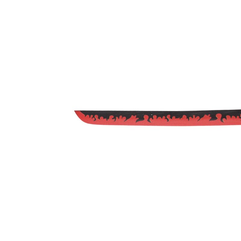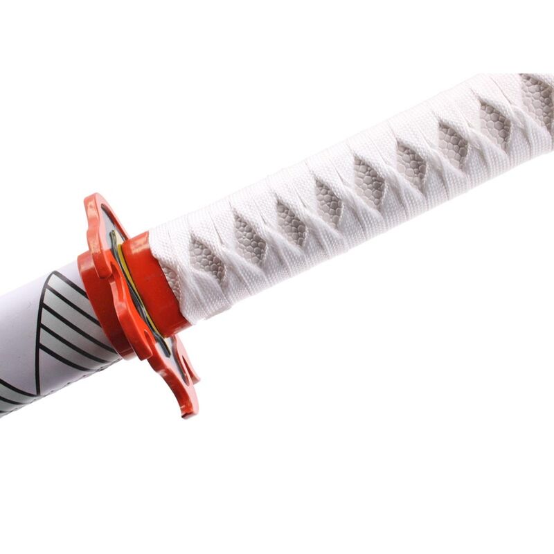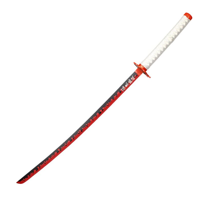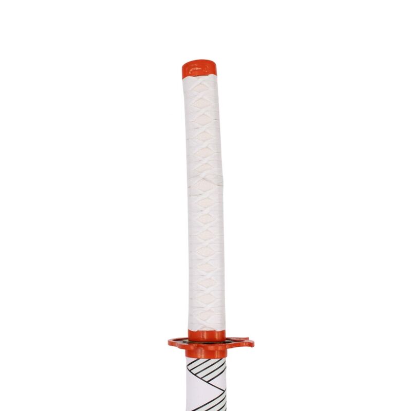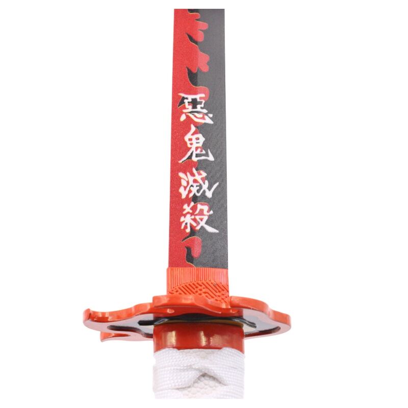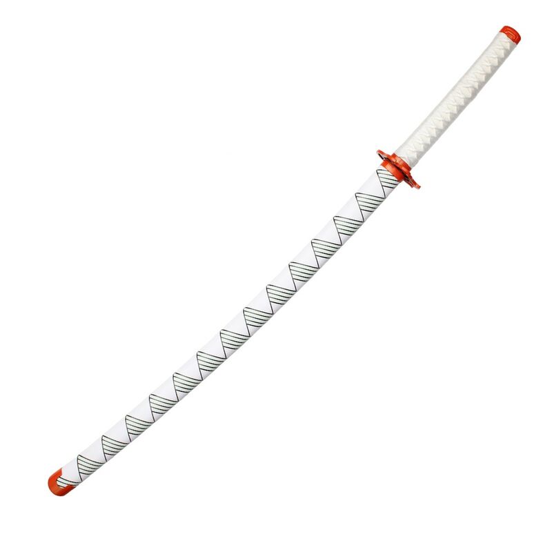 El tsuba mantiene el característico diseño en forma de llama y está fabricado en una resistente aleación metálica, aportando solidez y un acabado fiel al estilo del personaje. La empuñadura (tsuka) está construida principalmente en madera de alta calidad y cuenta con encordado en piel sintética blanca, ofreciendo un agarre firme y seguro además de una estética llamativa.