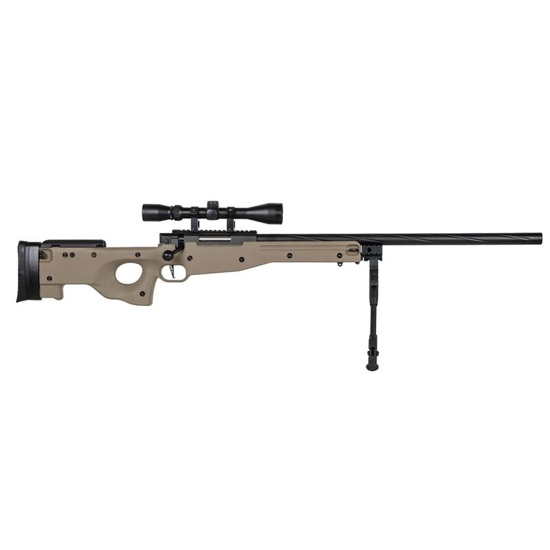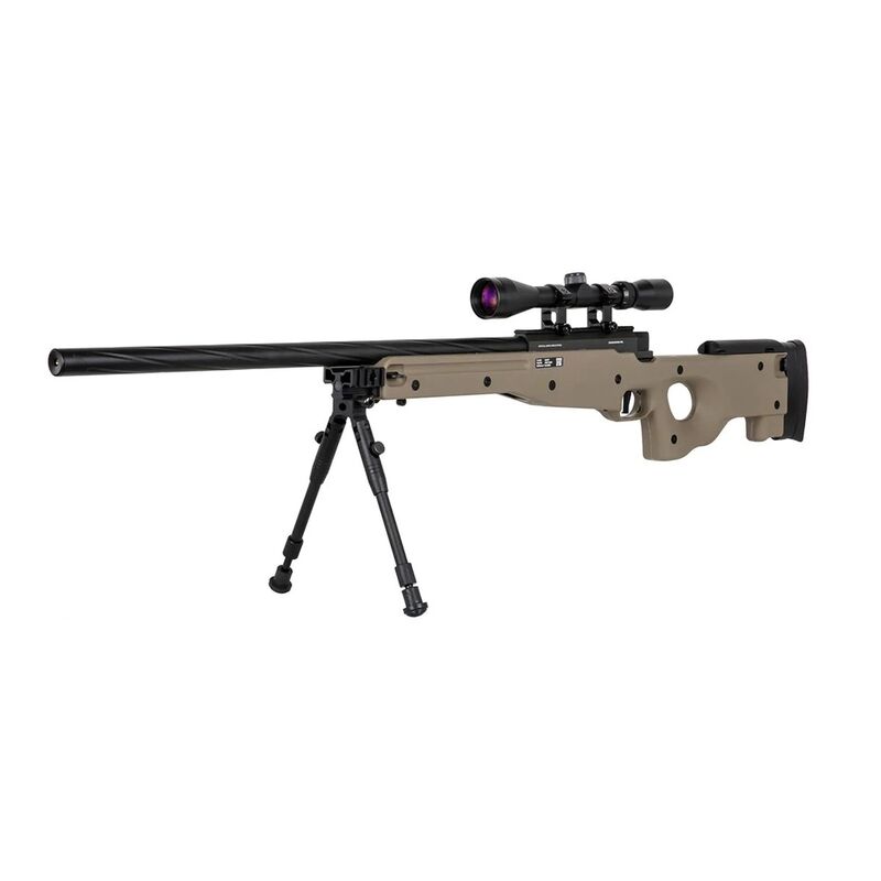 La potencia de disparo ronda los +/- 560 FPS, ofreciendo una excelente base para partidas de larga distancia. Además, el conjunto incluye un visor óptico de aumento y un bípode metálico plegable para mejorar la estabilidad en disparos de precisión.