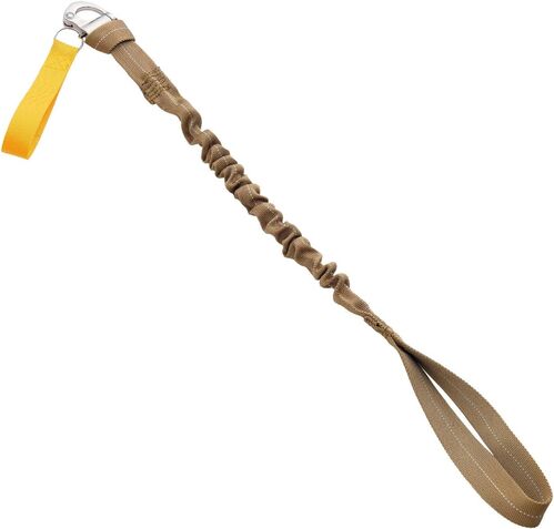 Su cuerpo elástico permite una longitud variable entre 78 y 98 cm, ofreciendo libertad de movimiento sin perder control del equipo. Incorpora un enganche metálico resistente para fijar con seguridad el equipo, y un tirador amarillo de alta visibilidad, ideal para identificarlo rápidamente bajo presión.