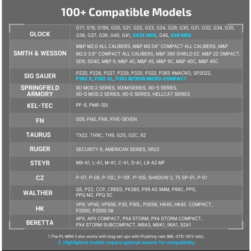 Compatibilidad: Glock, CZ, Taurus, SIG, PX4, Keltec, Canik, Ruger, S&W, y otras pistolas con riel Picatinny 1913