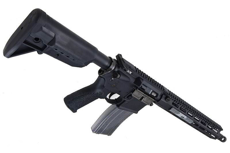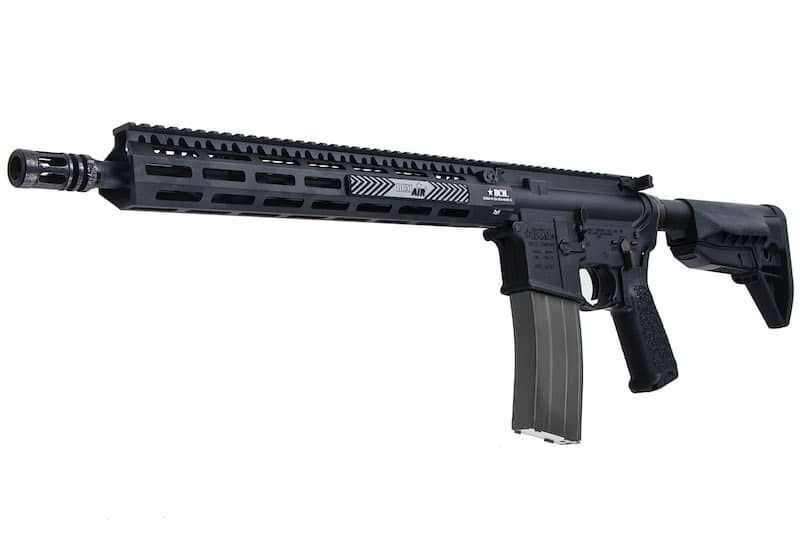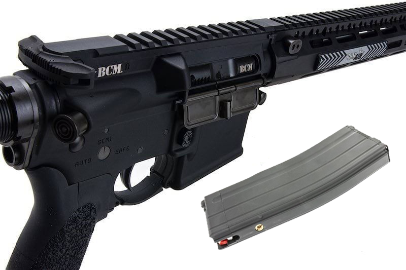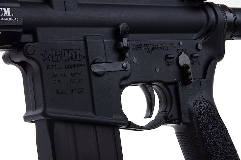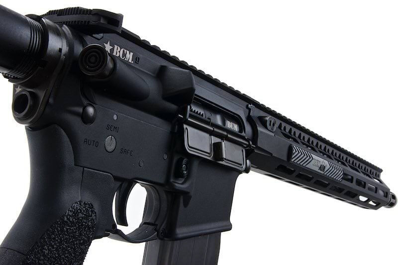 El sistema de carga está mejorado con una Palanca de Carga BCM Gunfighter ambidiestra, pensada para facilitar el manejo incluso con guantes o bajo presión, mientras que en la parte frontal encontramos una bocacha tipo compensador Gunfighter, fiel al diseño de control de gases de BCM, aportando carácter a la réplica. El guardamonte Gunfighter mejora la accesibilidad al disparador y la ergonomía general, especialmente en situaciones tácticas. El agarre está asegurado por el grip BCM Gunfighter MOD 3., que proporciona un ángulo más natural y cómodo para una postura de disparo eficiente, además de un texturizado especifico para mejorar el agarre con op sin guantes en las condiciones más extremas. Finalmente, la réplica se remata con la culata SOPMOD Mod 1 Gunfighter, sólida, ajustable, y con compartimentos internos que aumentan su funcionalidad en juego realista.