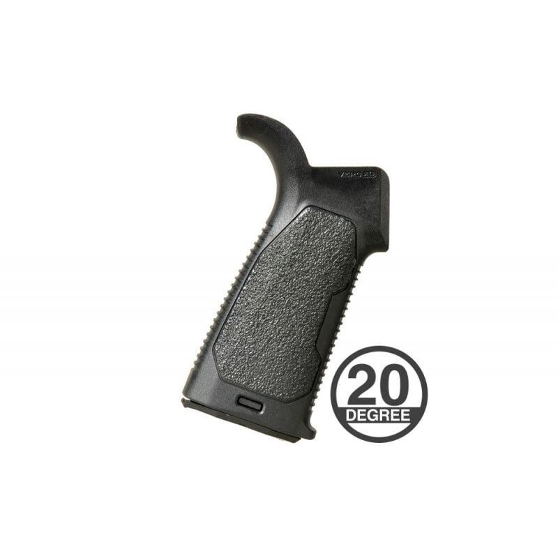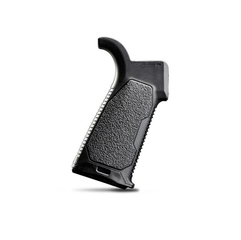 Su perfil más estilizado y cónico en la zona del arco de la mano permite una mayor libertad de movimiento al manipular los controles del arma, mientras que su anchura en la palma garantiza comodidad incluso en sesiones prolongadas de uso. Además, incorpora una cómoda cola de castor (“beaver tail”) que aporta estabilidad y soporte, y un compartimento seguro bajo una tapa de goma para almacenar pequeños accesorios.