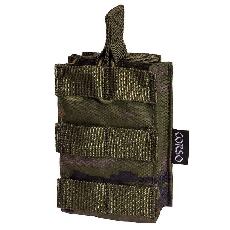 Arrrrr grumete llega a puerto Corso, con cierto olorcito a ron, y siempre va bien llevar más munición encima; por eso nos hacen falta algún que otro pouch para cargador. Este caso tenemos uno para un cargador suelto, con estilo single pouch en rollo Laser Cut, que le da un perfil más bajo y más moderno que el típico mole. Por debajo tiene un diseño de alta transpirabilidad y salida de suciedad. En la parte trasera consta de la típica tira de MOLE, con botón de cobre, para que puedas atarlo a cualquier sistema porta equipos con MOLE de manera segura y duradera. En él cabrá un cargador de G36 que podrás asegurar el cargador con los elásticos laterales.