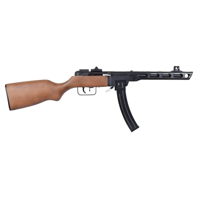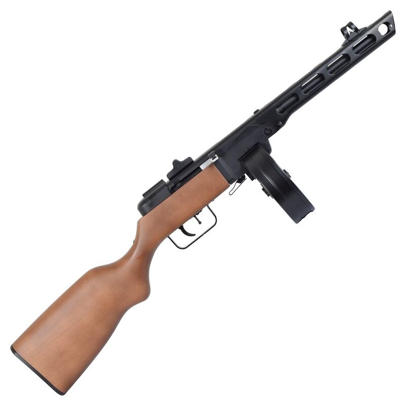 El PPSh-41 (Pistolet-Pulemyot Shpagina) es un subfusil soviético icónico de la Segunda Guerra Mundial, diseñado por Georgy Shpagin como arma barata, fiable y de alta cadencia para la infantería. Originalmente en calibre 7,62×25 Tokarev, se caracteriza por su ritmo de disparo muy alto (alrededor de 900 disparos por minuto en muchas fuentes), su simplicidad mecánica y por el uso de cargadores tambor de gran capacidad (la versión clásica tenía tambor de 71 cartuchos) que lo convirtieron en una pieza temida en combates cercanos y urbanos. Su diseño priorizaba la producción en masa y la facilidad de uso en condiciones adversas.