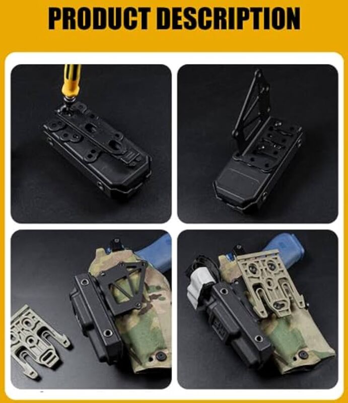 Fabricado en aluminio mecanizado, garantiza una resistencia superior al desgaste y a impactos, manteniendo un perfil bajo y un ajuste firme. Su diseño compacto permite montarlo en la parte frontal o lateral de la funda, así como directamente en plataformas MOLLE, optimizando el espacio y la funcionalidad del equipo.