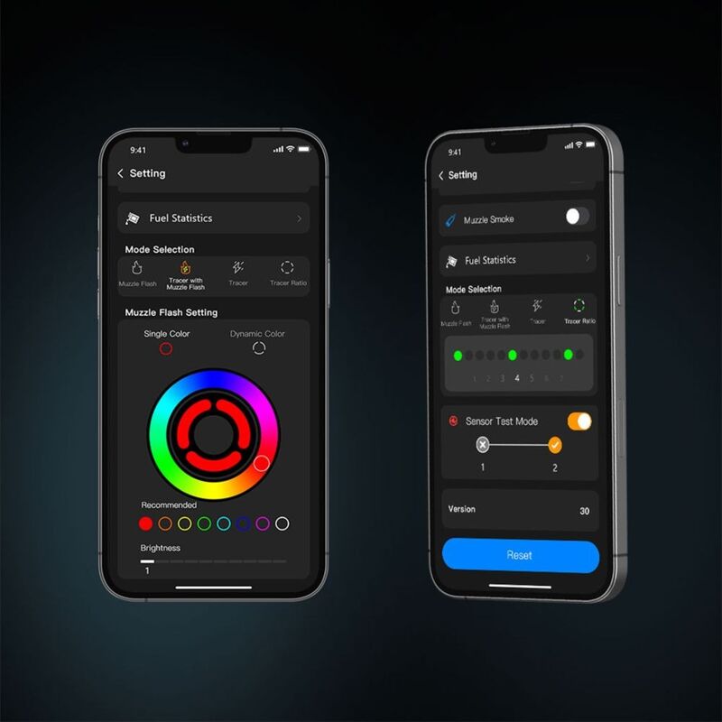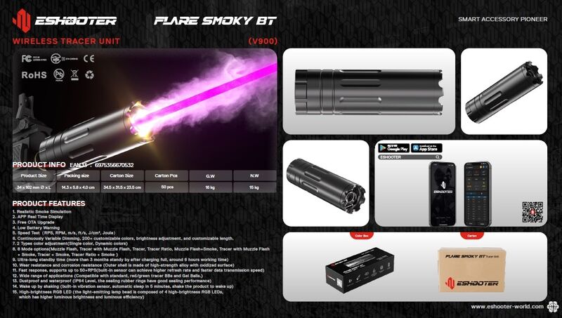 El Flare Smoky BT V900 de E-Shooter lleva los trazadores a un nuevo nivel de realismo con efecto de humo, simulación de fogonazo y conectividad Bluetooth. Su innovador sistema genera un efecto visual único al disparar, combinando tracer, fogonazo y humo para una experiencia totalmente inmersiva.