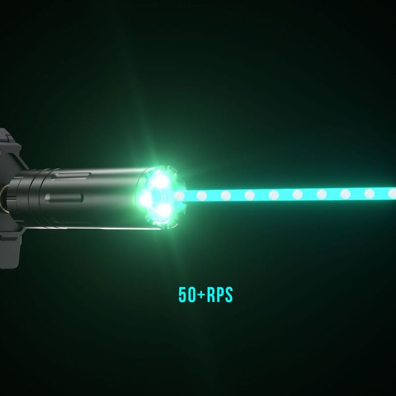 Gracias a la APP móvil, permite monitorizar en tiempo real la velocidad de disparo (RPS, RPM, m/s, ft/s, Joules), personalizar colores, brillo y modos de iluminación. Su carcasa de aleación de alta resistencia con acabado anodizado garantiza máxima durabilidad incluso en las condiciones más exigentes.